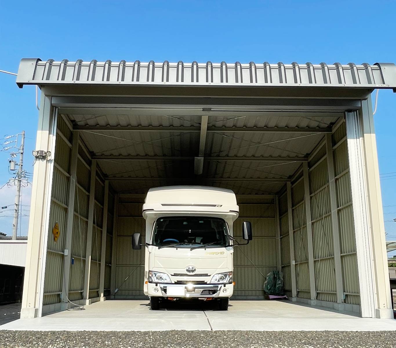 大切な車を雨や風から守るだけでなく、シャッター付きのため防犯面でも安心。出し入れのしやすさにも配慮しており、キャンピングカーはもちろん、ハイエースなどの車両も余裕をもって駐車できます。