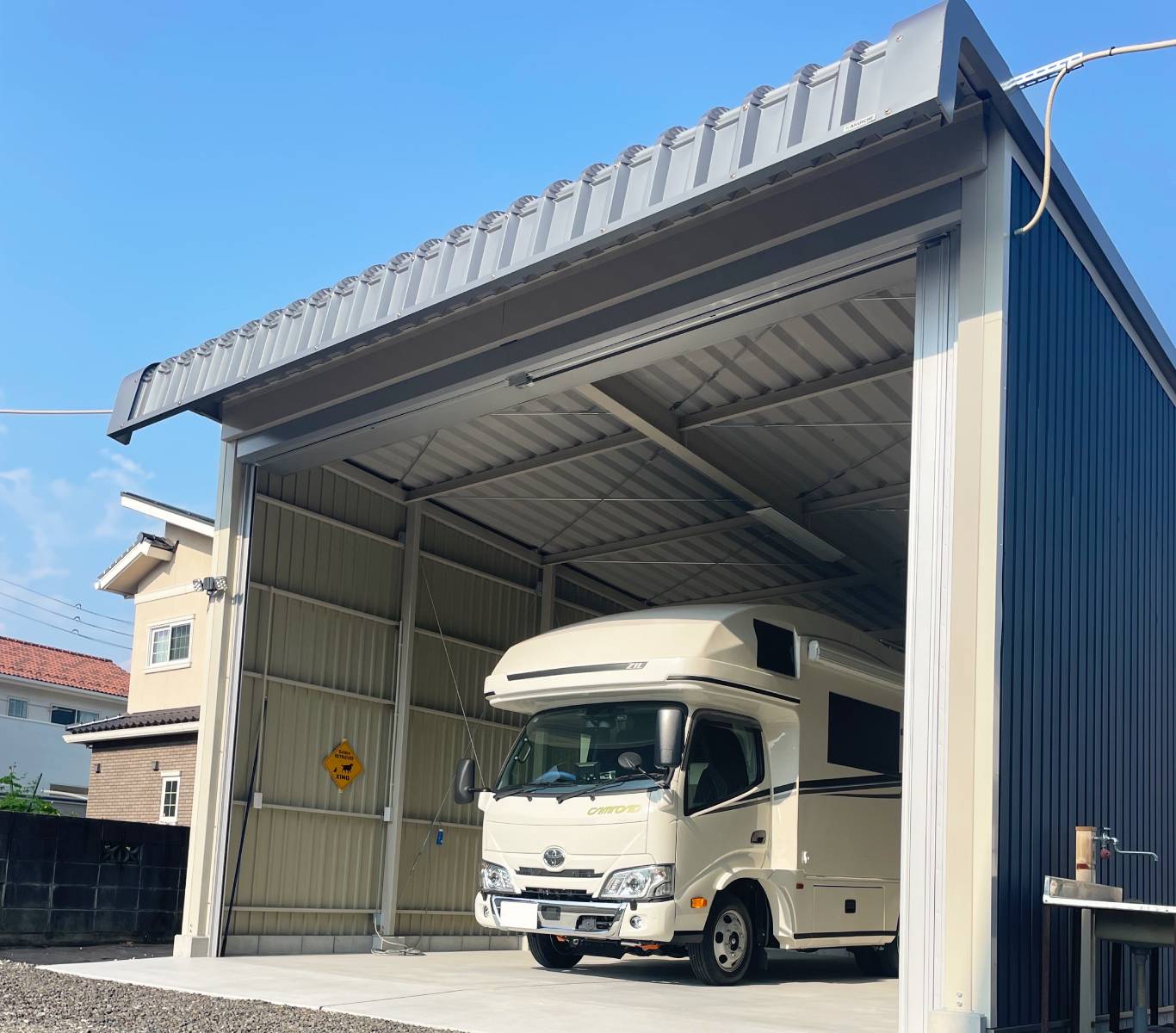 岐阜県可児市にて、シャッター付きの車庫を施工しました。高さと間口にゆとりを持たせることで、キャンピングカーも余裕をもって収納できる設計となっています。