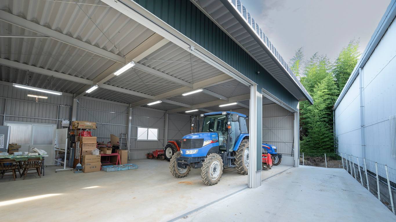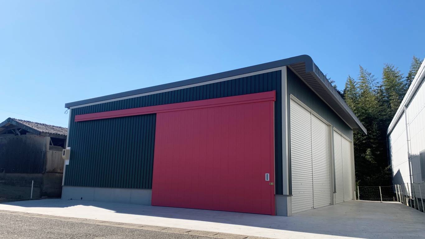 愛知県田原市にて、いちご農家様の農業用倉庫兼事務所を新築しました。ハンガードアとシャッターを組み合わせることで、大きな開口を確保し、農機具や資材の出し入れがしやすい設計になっています。用途に応じて開け方を変えられるため、日々の作業効率にも配慮しています。