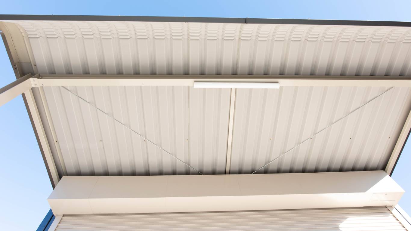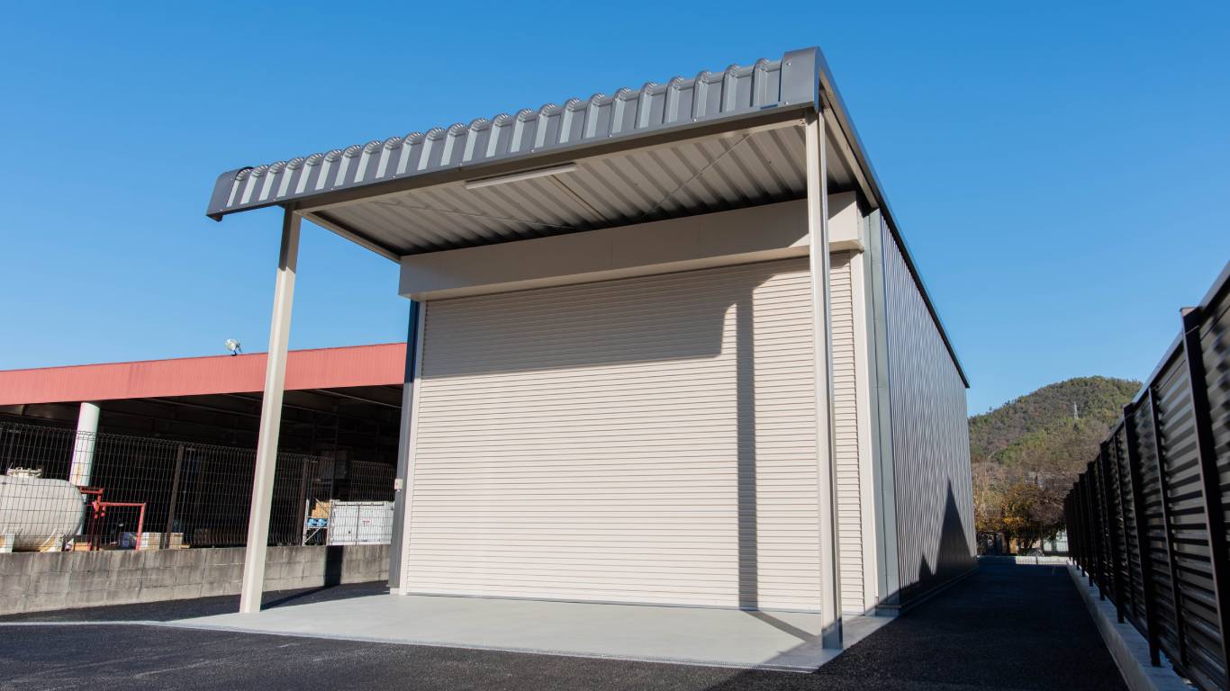 製品の保管と出荷作業を想定し、荷物の積み込みや作業がしやすい広さを確保したシンプルで使いやすい倉庫となっています。また、倉庫には屋根付きのヤードを設けることで、雨の日でも製品や荷物が濡れることなく、トラックへの積み込みや搬出作業ができるようになっています。